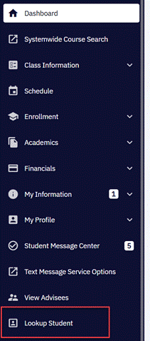 - Choose to “Look Up” a student from the left-hand navigation.