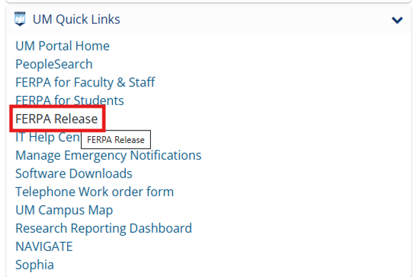 - Under the “UM Quick Links” menu, look for FERPA Release. This will take you to the consent form.