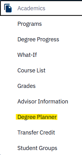 Degree Planner can be accessed from the Student Center dashboard in the left-hand navigation under Academics.